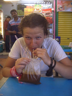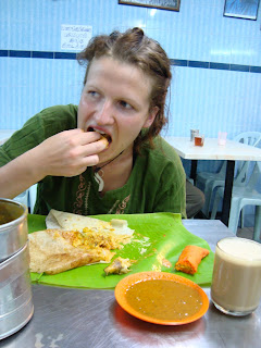 Największa jednak gratka to niekończąca się chyba podróż po smakach i kolorach kuchni indyjskiej. Little India nie jest może duża ale to właśnie tam przeżyliśmy z Kami najbardziej egzotyczną kulinarną przygodę :). Restauracja Krsna (75 Lebuh Pasar – osobiście polecam!) wyglądem przypominająca raczej tani bar niż przybytek zwany restauracją serwuje tanie i bardzo dobre żarełko, nie musiałem szefowi sali tłumaczyć iż jestem 'bezmięsnym', Hindusi doskonale wiedzą co to znaczy – genialni ludzie :)!, pokiwał głową ze zrozumieniem a ja poddałem się rekomendacji 'dania dnia'. Jako napitek pojawiła się Masala Teh, herbata z mlekiem oraz lekką mleczną pianką na wierzchu (powstałą podczas specjalnego procesu nalewania z dużych wysokości, zależnie od długości ramienia nalewającego :) i korzennymi przyprawami - smak tak przedziwny i oryginalny, dający się spuentować hasłem: 'herbata na ostro' ;)) - zdecydowanie warta spróbowania. Teraz zaś gwóźdź programu czyli danie główne. Wzmiankowany przybytek kulinarny specjalizuje się w daniach typu 'banana-leaf-meal' czyli coś co dzieci i nie tylko ;) zapamiętają do końca życia i potwierdzą, że jedzenie może być zabawą – najsmaczniejszą zabawą na świecie :))!! Banana-leaf-meal (choć bardziej trafne określenie to banana-leaf-mess ;)) to danie serwowane na prawdziwym liściu bananowca. Na środku pojawia się ryż lub zawijany 'naleśnik' wypełniony farszem typu masala, dookoła zaś w małych miseczkach różne sosy/dodatki w liczbie minimum sześć (jako szczęśliwiec miałem szansę też i konsumować zestaw z 8 dodatkami!!). Teraz czas na atrakcję wieczoru :). Do posiłku nie podaje się ani pałeczek ani noża, widelca czy łyżki, je się wyłącznie... rękami a dokładnie tylko prawą :)) (lewa jest zarezerwowana dla tzw. czynności ubikacyjnych). Ryż miesza się z wybranym dodatkiem, zalewa sosem dostępnym na stole (przeważnie 3 do wyboru) i... pakuje się palcami prosto do buzi :)). Po chwili bałagan (zwłaszcza u początkujących takich jak my :) na liściu przypomina zupopodobną papkę ale połechtane kubki smakowe doznaniami od kwaśnych, słodkich po ostre i korzenne wysyłają tylko jeden sygnał – raj :))!! Oczywiście po chwili byliśmy upaprani ryżem po sam przegub ale nic to – dawno się tak dobrze nie bawiłem przy stole :)). Na zakończenie dostałem jeszcze 'murtebak' rodzaj indyjskiego placka jak pizza, który już ledwo zmieściłem, konsumowany oczywiście tym samym sposobem, a wszystko to kosztowało mnie 4,5 RM :)!!! Niebo w gębie :)!! A tak wygląda Kami nad swoim 'liściem' :))
