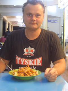 Największą jednak dla nas atrakcją Georgetown bezapelacyjnie było... jedzonko :)!! Pennang jest kulinarnym centrum Malezji, krzyżują się tu wpływy kuchni chińskiej, malajskiej, indyjskiej i tajskiej. To właśnie tutaj, zagłębiając się w jedną z etnicznych dzielnic, ma się niepowtarzalną szansę zapoznania z różnymi 'filozofiami kuchennymi' ;)). W chińskich knajpach i u sprzedawców ulicznych (czyli tam gdzie jest najtaniej, najciekawiej i gdzie jadają autochtoni i my – reszta 'białasów' woli śniadania kontynentalne za 3 razy więcej w specjalnych knajpach serwujących jedzenie zachodnie:) królują 'mee' (czyt. mi) czyli smażone, wszelkiego rodzaju noodle/jajeczne, ryżowe, sojowe makarony z mięsiwem wszelkim do wyboru (nawet wieprzowiną nie uznawaną przez muzułmanów) i gotowanymi warzywami oraz dania z ryżem na wszelkie możliwe sposoby. Kuchnię malajską eksplorował Mały w Espalande Food Centre czyli w miejscu gdzie są skoncentrowane stragany z żarciem, a miejscowych przewija się masa. Zafundował sobie 'rojak' (czyt. rodżak, po malezyjsku: mix) ze wszystkich dostępnych na straganie owoców morza, podlanych dość ostrym sosem pomidorowym (sos ciepły, frutti di mare zimne), porcja była tak wielka że Mały pod koniec się poddał i nie wmłucił wszystkiego :), jego podniebienie było jednak wniebowzięte, portfel zresztą też bo ta orgia smaku kosztowała go tylko 5RM (czyli... 5 zł!!). Oto dowód: